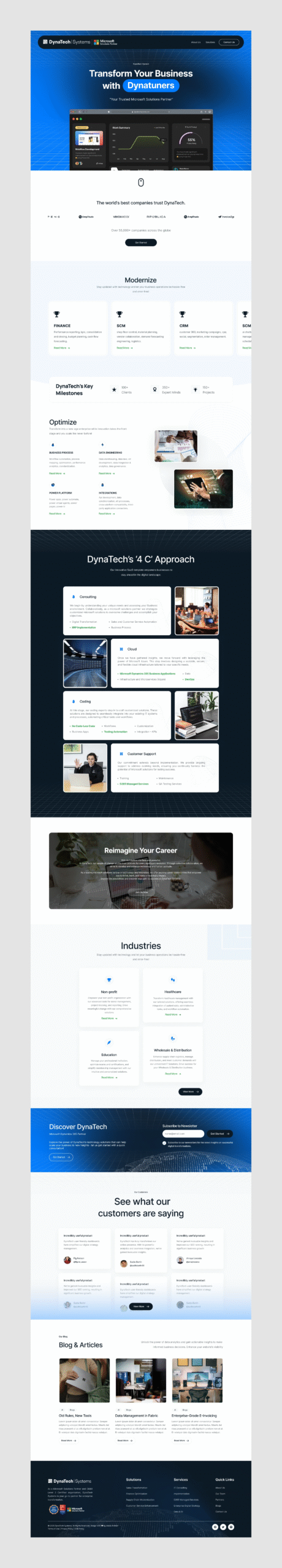 The DynaTech website is designed to provide a seamless and modern platform for businesses looking to optimize and modernize their operations. The website focuses on offering cloud-based solutions that help businesses transform their workflows and improve operational efficiency. With a sleek and responsive design, DynaTech offers users an intuitive experience that highlights its core services, industries served, and customer testimonials.