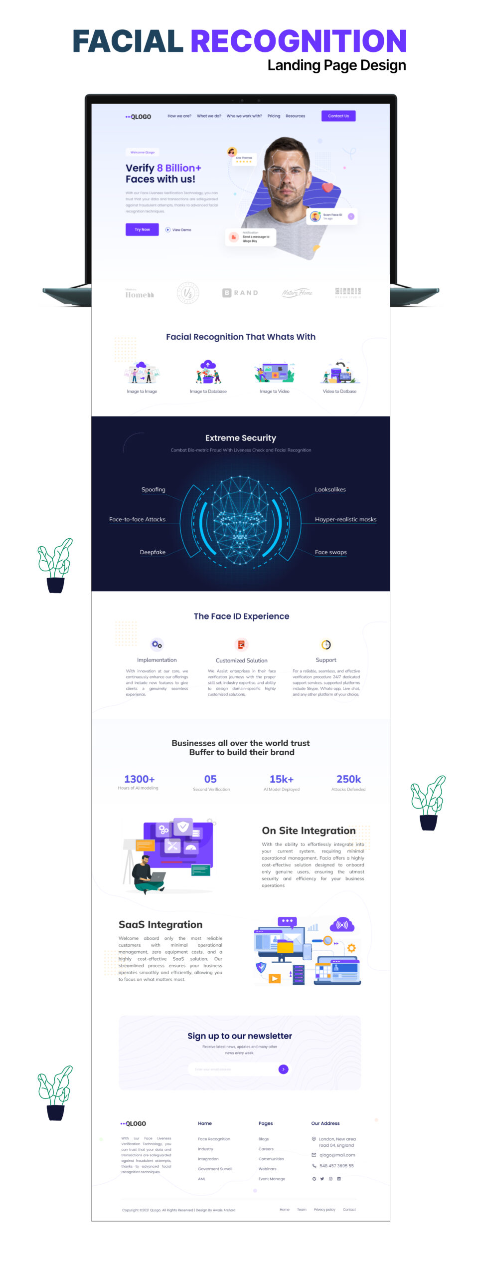 This project focuses on designing a modern, high-trust landing page for an AI-powered facial recognition platform. The goal was to visually communicate advanced security, scalability, and enterprise-grade reliability while keeping the interface clean, approachable, and conversion-focused.