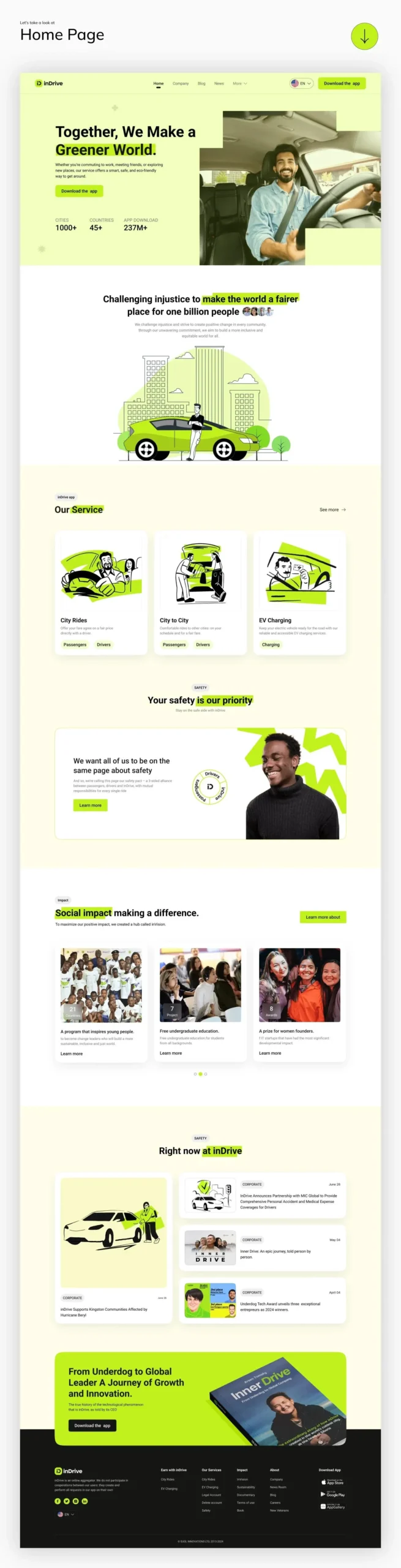 The InDrive platform provides users with a simple, intuitive way to book rides and manage their transportation needs. The design highlights the platform’s key features, including sustainability and social impact, while ensuring a seamless user experience across all devices. The platform is easy to navigate, focuses on safety, and delivers real-time ride management.