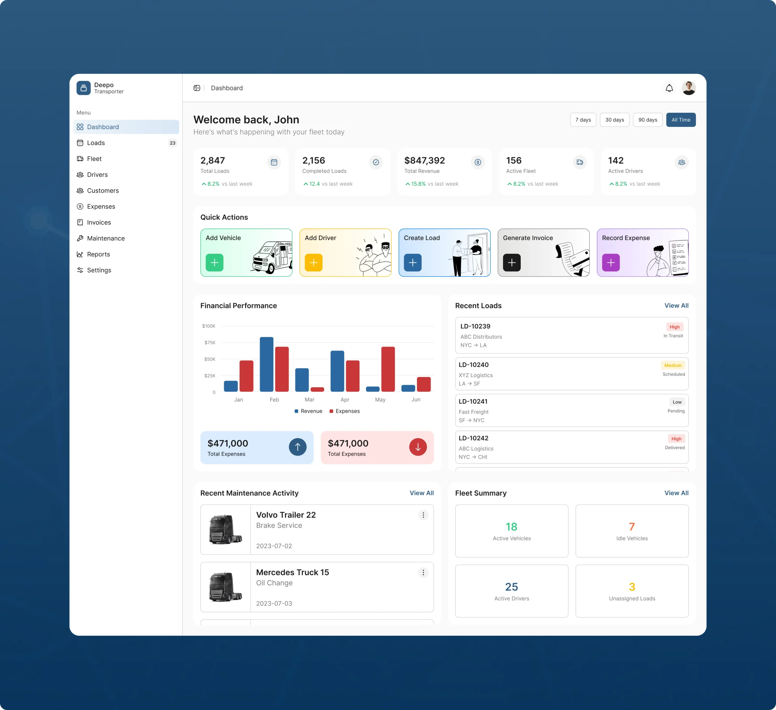 • Provide a user-friendly dashboard that offers a comprehensive overview of the fleet’s current status, including key metrics such as completed loads, revenue, and active drivers.